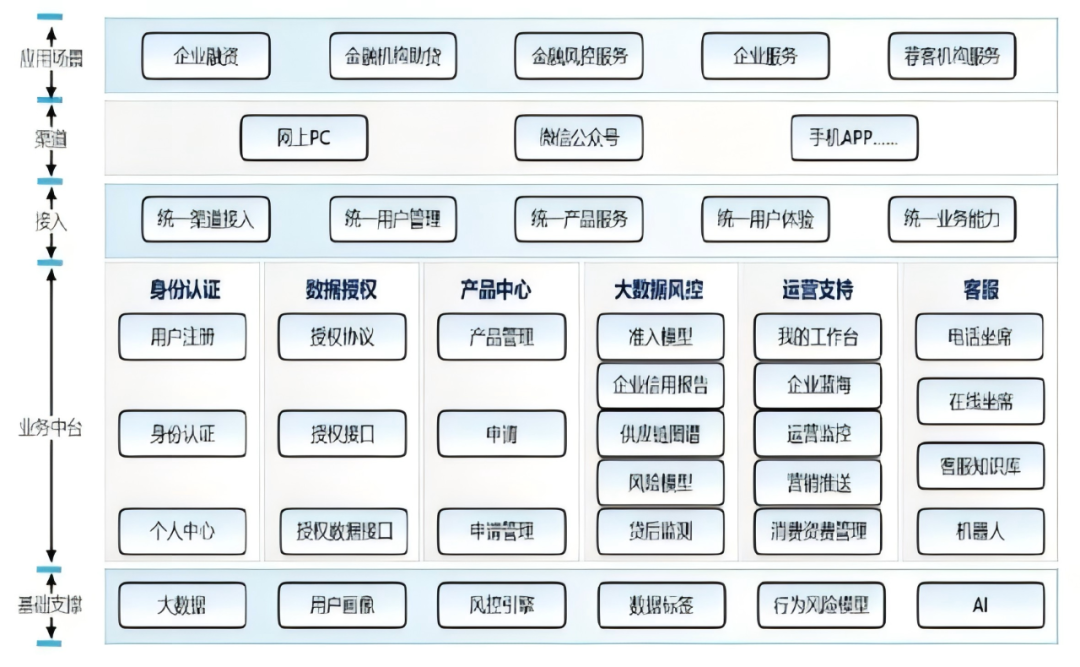 平台以多源数据整合与技术创新为核心路径,构建全链条服务架构。通过汇聚税务、工商、法务、房管、社保、人民银行、网络舆情等多渠道异构数据,经融合、清洗、治理及入库等标准化处理后,精准赋能金融风险监控、中小企业金融科技服务、智慧政务决策辅助三大核心模块,在多源异构数据融合、跨部门数据共享交换、全流程信息安全保障等方面实现技术突破,通过实践验证凝练形成可复制的理论与实操经验,引领大数据技术在数字金融领域的深度应用。针对不同服务对象,平台定制差异化推广方案,面向中小微企业免费开放全部功能,践行国家扶持实体经济政策,通过搜索引擎、短视频、行业论坛等网络推广渠道汇聚流量,联合政府单位、行业协会开展活动推广,依托优质内容引发口碑传播,实现普惠服务全覆盖;面向银行等金融机构,采用模块化建设模式提供灵活组装的“智能风控工具”,通过行业推荐、客户经理营销、存量客户定向转化、产品发布会宣传等方式,借助深耕金融科技行业的品牌优势与全国性市场布局,快速拓展合作网络;面向监管机构,重点提供融资动态、贷后回收、产业链供需、舆情监测等多维分析能力,通过线下面对面推广方式,助力政府精准掌握产业现状与经济潜力,提升决策科学性。