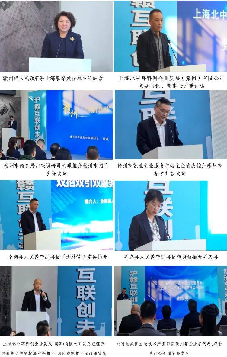 (2)沪赣合作开启新篇章。北科创集团董事长许勤表达了将上海的技术、资金、平台资源与赣州优势相结合的良好意愿。集团副总经理王勇详细介绍了主营业务、园区载体及相关政策。赣州市、全南县、寻乌县代表分别就招商引资政策、招才引智环境及县域特色优势进行了专题推介。